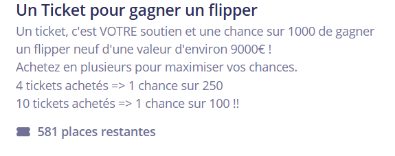Pour rappel, vous avez l’opportunité de gagner un flipper neuf, dont vous choisirez le modèle et avec l’achat de ce billet, vous nous permettez d’acquérir une nouvelle machine que nous installons gratuitement dans un lieux accueillant des malades.